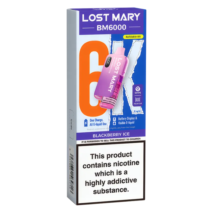 Blackberry Ice Lost Mary BM6000 has a unique and stylish look with the pod tank provided on the side. The amount of e liquid left in this pod tank is visible, helping you track your vaping habit and e liquid used. New Lost Mary vapes now allow you to recharge the device with 1000mAh and fast charging capacity. The device is completely legal and TPD-compliant in the UK market. When e liquid runs out, simply insert a new set of Lost Mary BM6000 Pods and continue vaping.