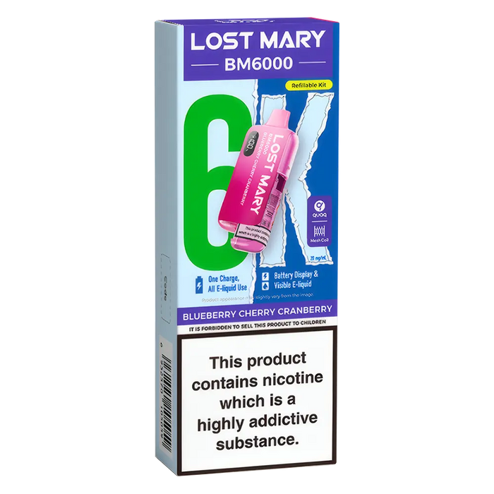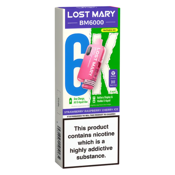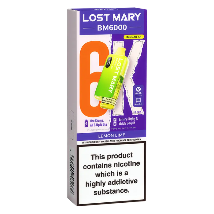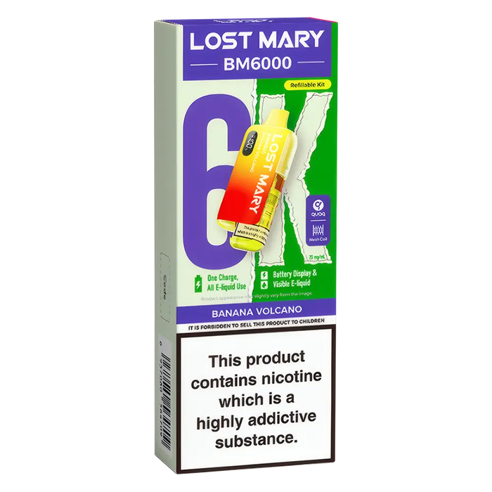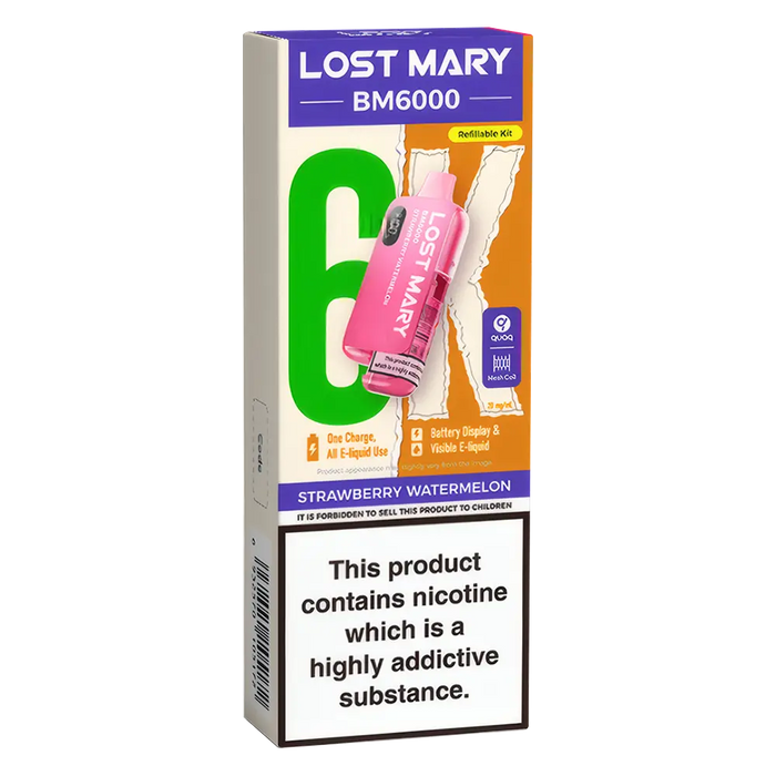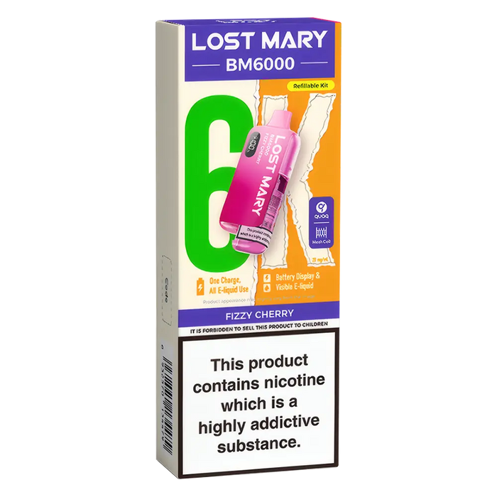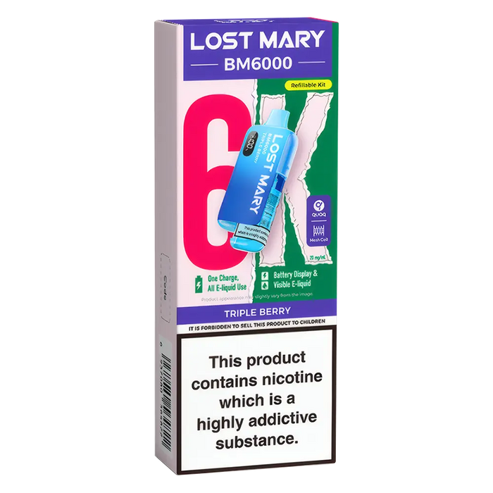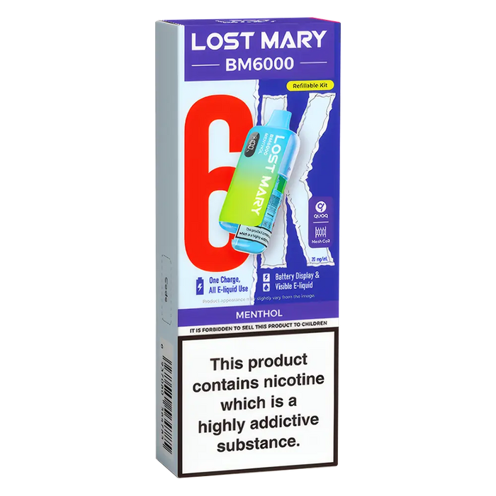 The Lost Mary BM6000 Prefilled Pod Kit is compatible with Lost Mary BM6000 Prefilled Pods, available in 36 flavours