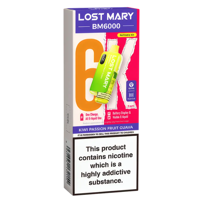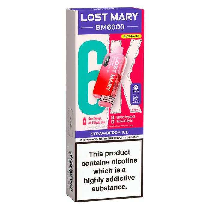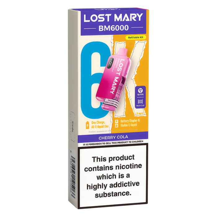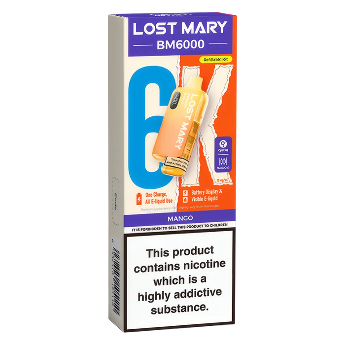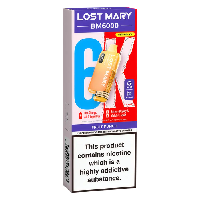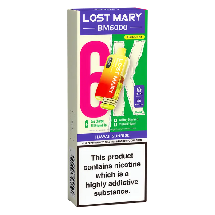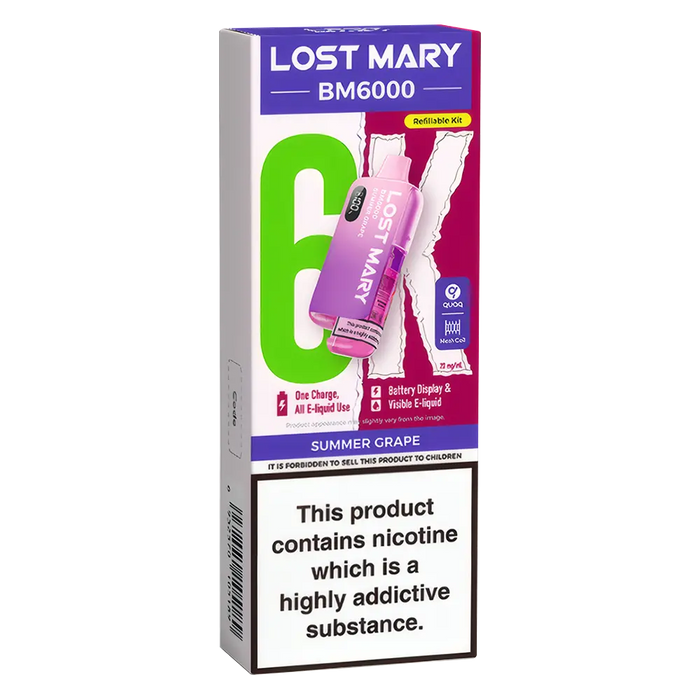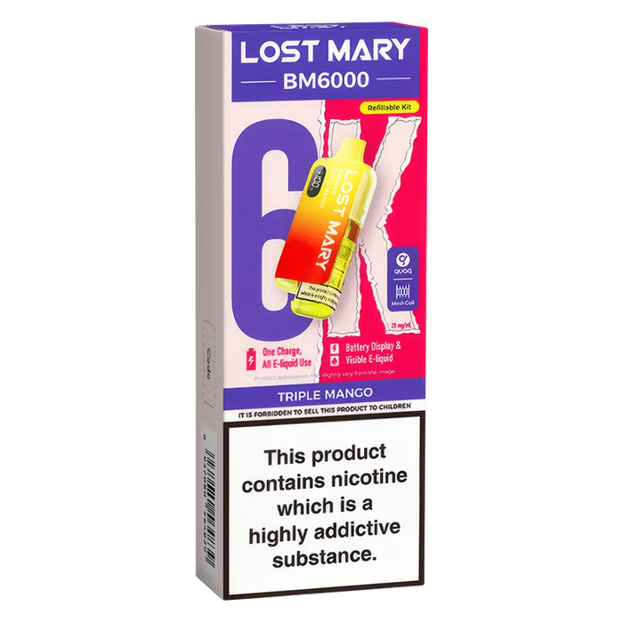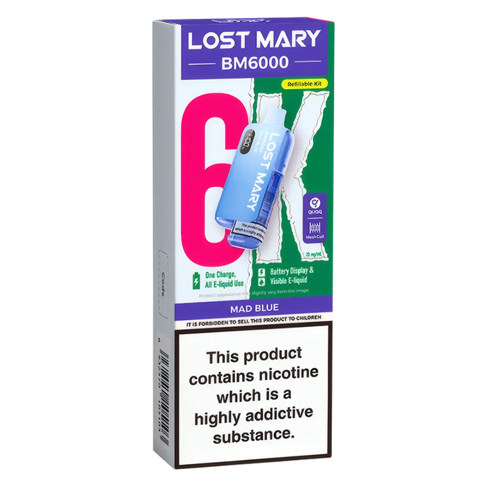 The Lost Mary BM6000 Prefilled Pod Kit is compatible with Lost Mary BM6000 Prefilled Pods, available in 36 flavours